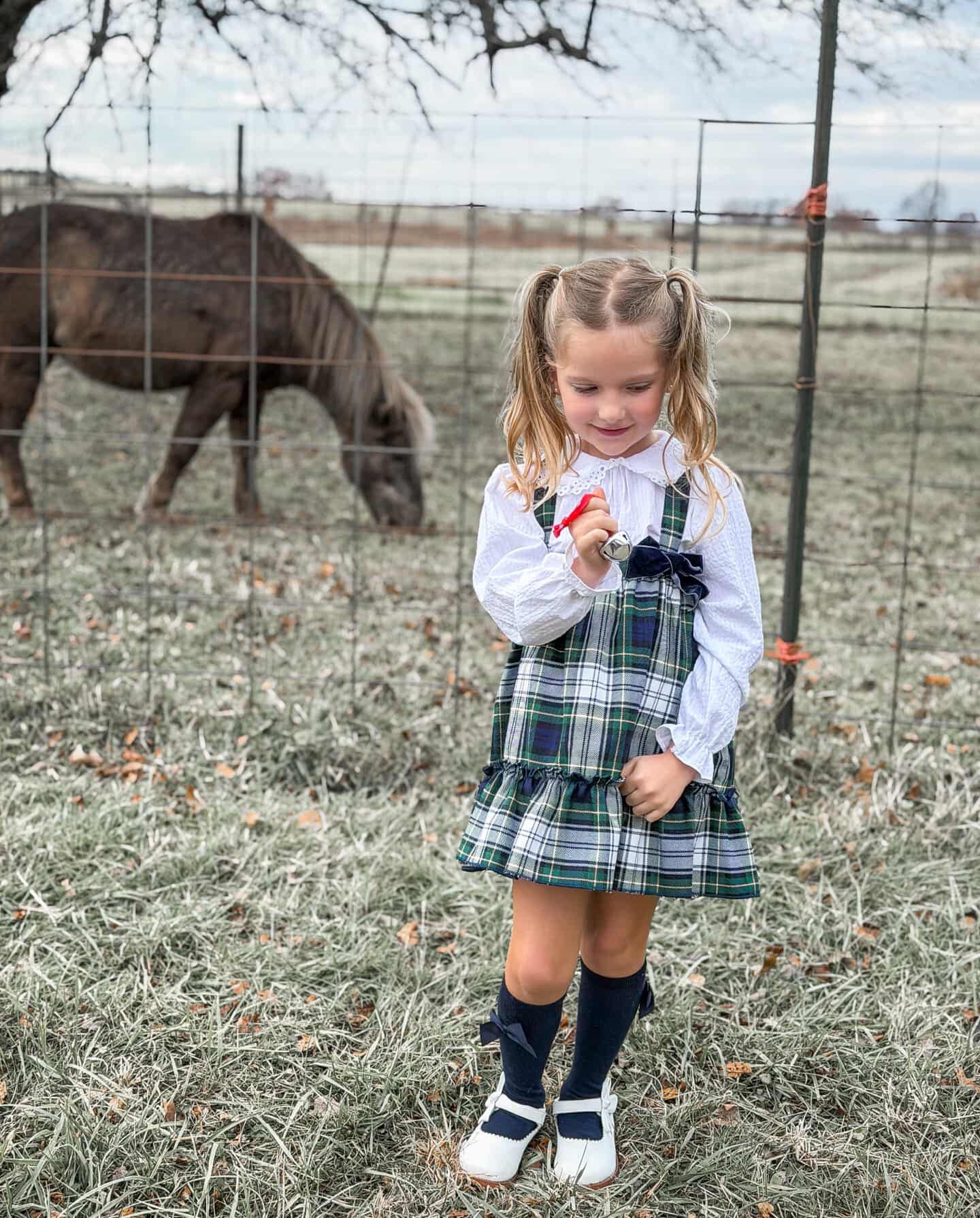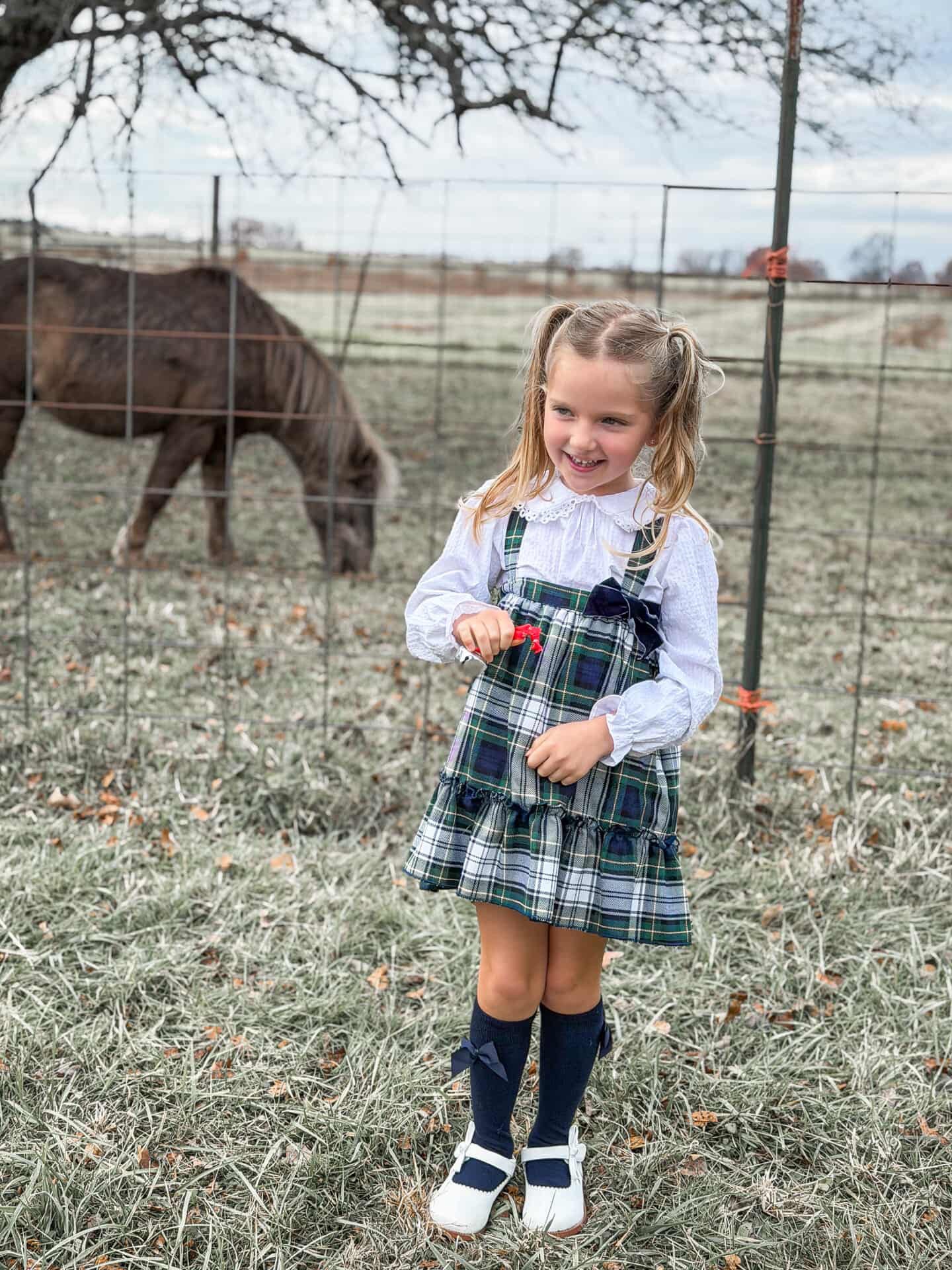 Valentina Bebes baby girl's dress set. White long-sleeve cotton blouse with divine lace trimmed rounded collar underneath green and navy checkered pinafore dress decorated with a navy blue velvet bow. Outfit is completed with matching bloomers.