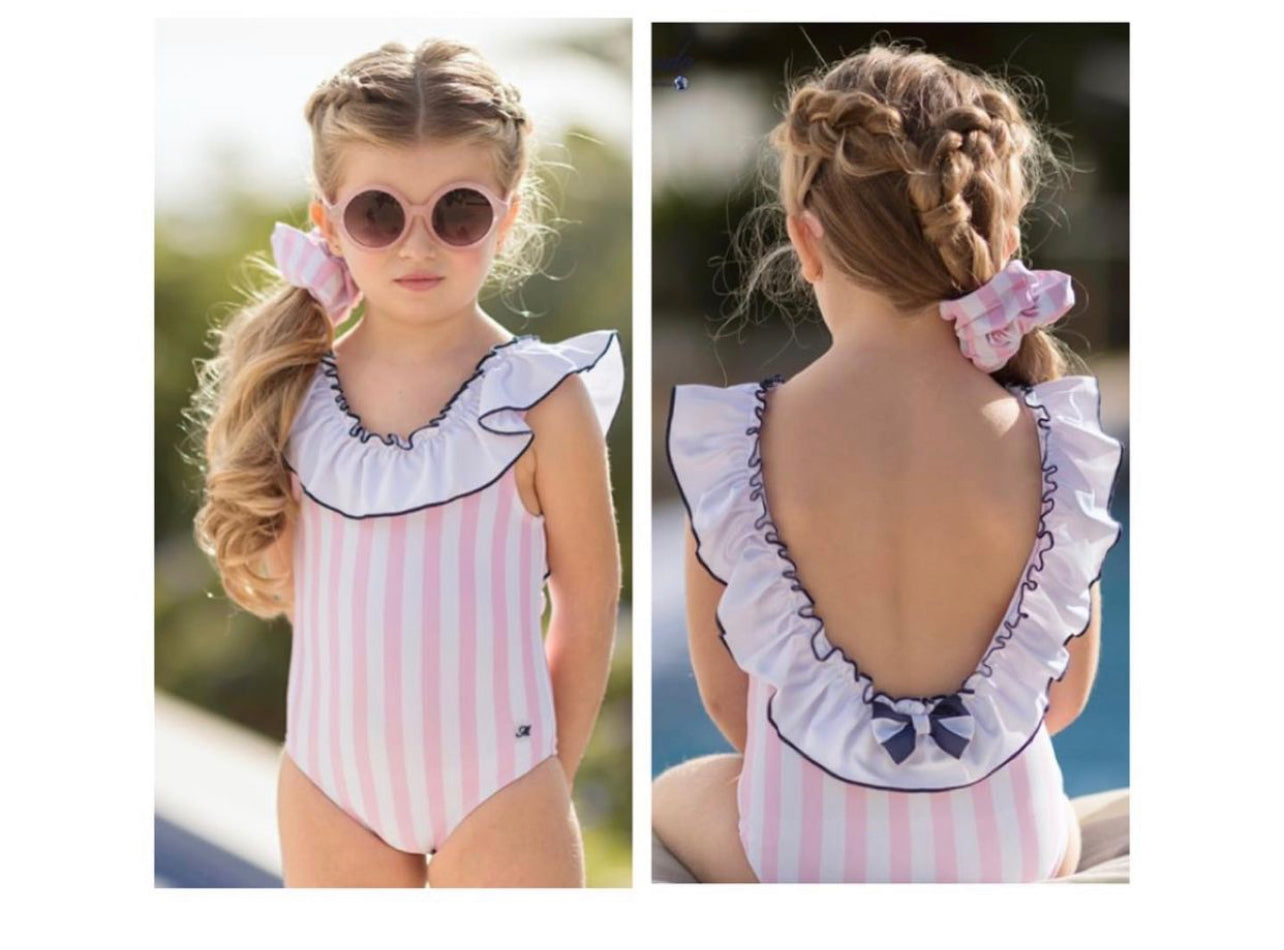 Miranda pink and white striped swimsuit with ruffle detail from front to back. Open back has small bow detail in the center.